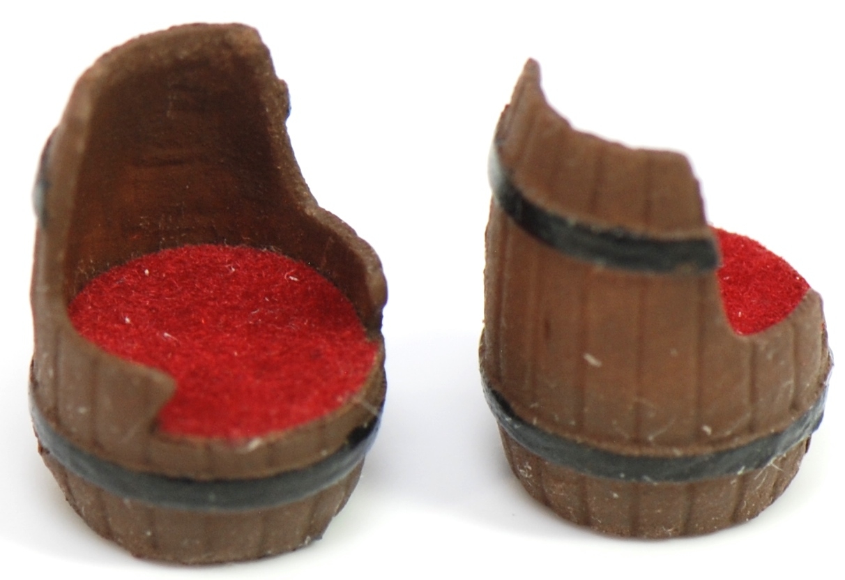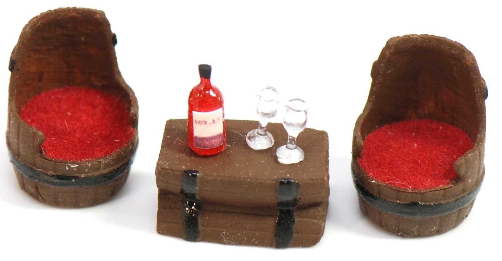This is an adorable 3D printed set of 1:48 chairs. They come on supports you trim off and then paint! No more cutting wine barrels in half to make the chairs! These are all done and ready to be painted. They also have cute little arms on them and come with beautiful laser cut red velvet seat covers.