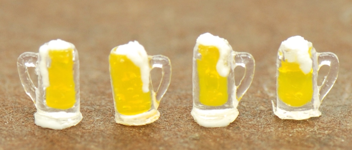This is an amazingly tiny quarter scale set of 3D printed Beer steins. They come on a sprue for easy painting. Just paint the outside with clear fingernail polish and fill the inside with your beer color of glass paint or resin. Top it off with a bit of foam. I use my frosting kit for this. Makes the cutest foam!