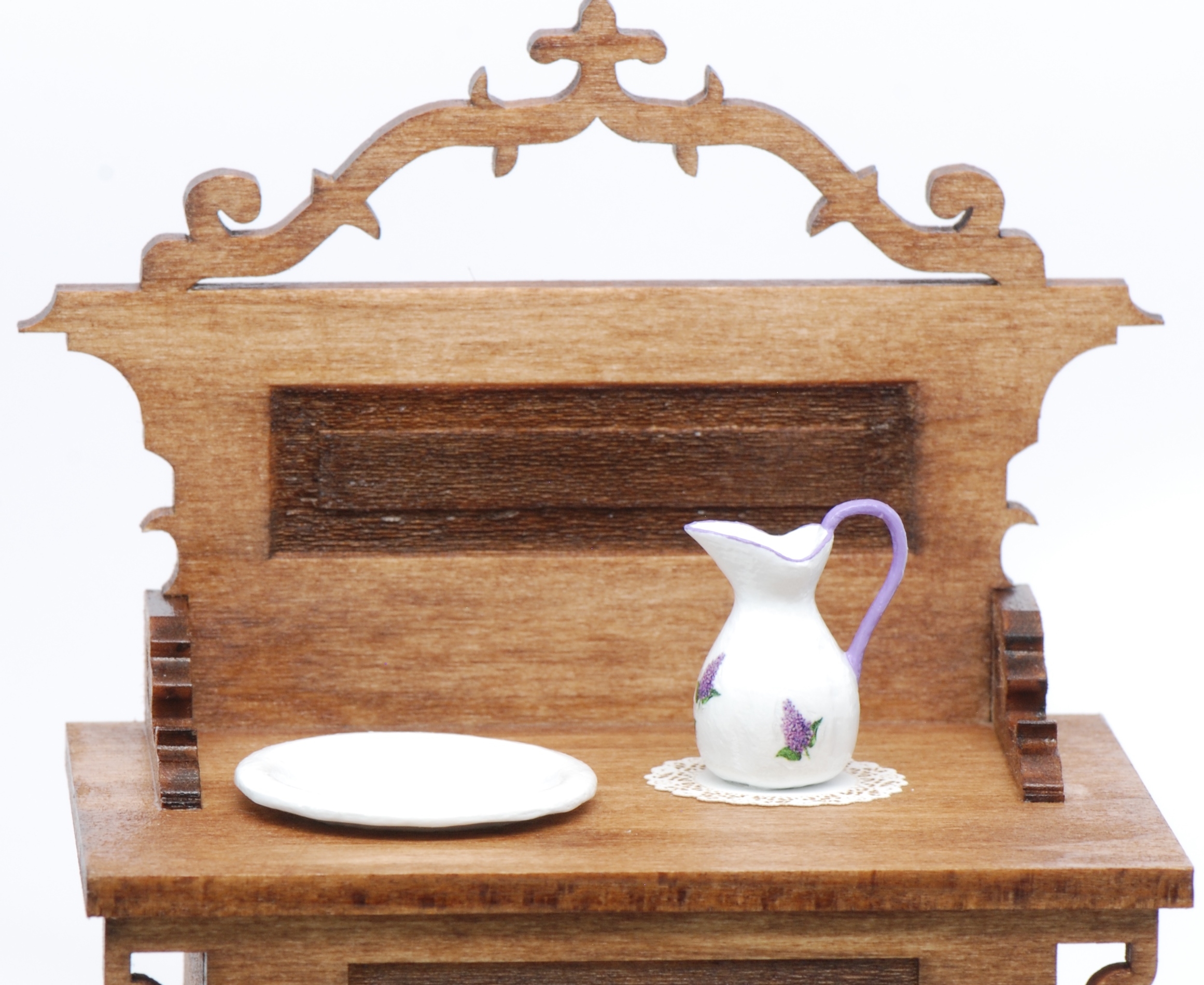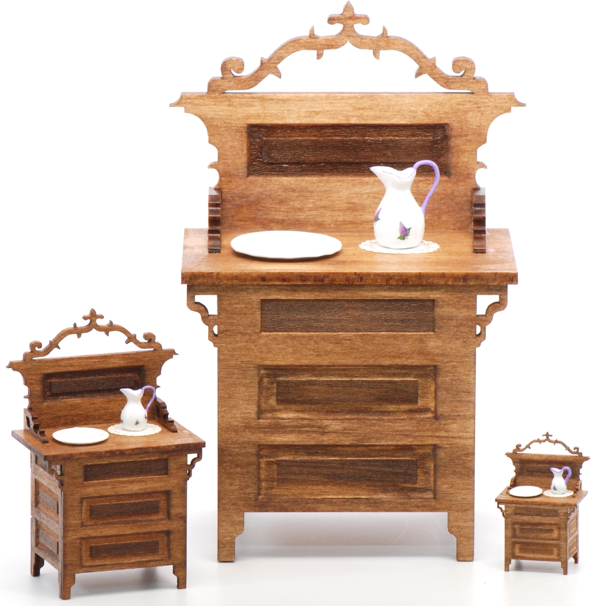 This is a wonderful kit and super easy to assemble in just minutes. It's beautifully laser cut and designed to look like it could have drawers. There are 2 table tops for this kit. One to use if you want the pitcher sitting on top and one with a hole in it if you want it to sit down in the stand. You get to choose. Also it comes with a basin and pitcher set 3D printed and ready to paint. Theres a lilac flower decal for the pitcher and doily for underneath the pitcher too! A very fun kit to finish off or help decorate a room.