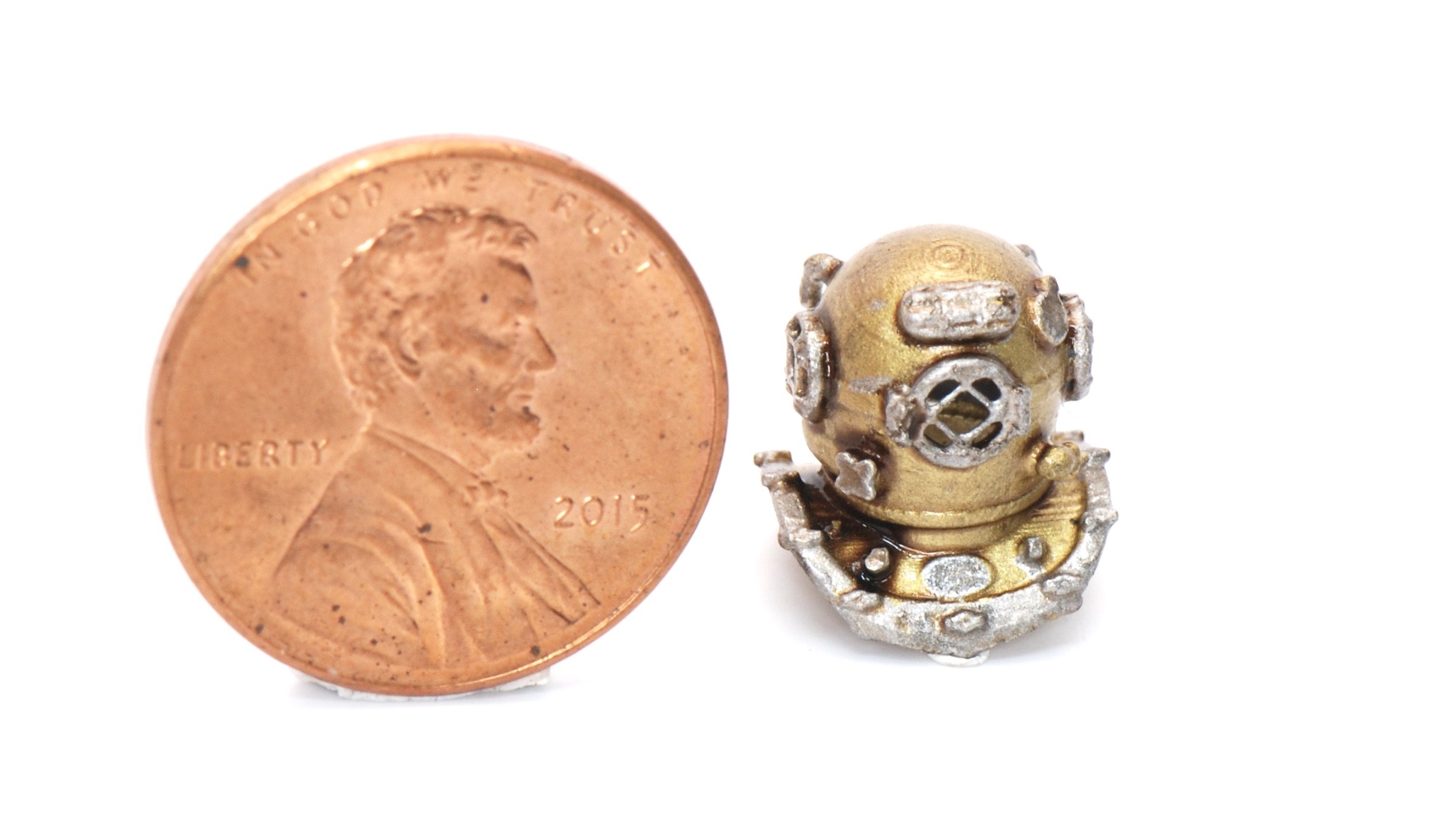 This tiny amazing Diver's Helmet is 3D printed and ready to paint. Once painted you can trim it off it's supoorts and use! Super fun in your 1:12 and 1:24 scenes as well for shelf decorations.