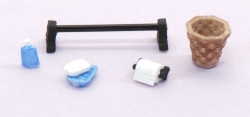 Comes with a towel rack, soap dispenser, bar of soap and holder, waste basket and a roll of toilet paper. Easy to paint and trim off the supports. This kit comes with detailed color directions on how to paint it.