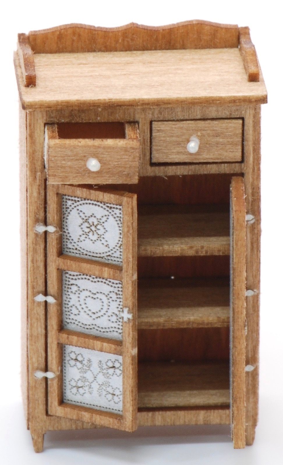 This is a really fun and cute pie safe kit. It's laser cut out of wood and the silver inserts for the cupboards are laser cut too so all you do is glue in place. This kit comes with detailed color directions on how to assemble from start to finish. A super fun addition to your miniature scene!