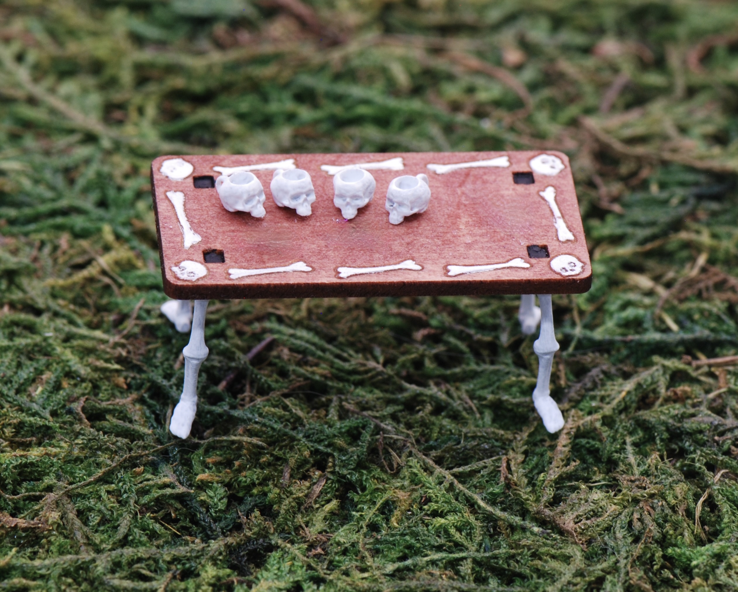 This fun set is such a cute addition to your miniature scene! You can choose the Bones Table which is a laser cut table with 3D printed bone legs for the table legs or you can choose the set of 4 3D printed skull cups, or get both! These spooky cups have handles on the back of the skulls and are hollow in the inside so you can fill them with spooky liquid! The kits come with detailed color directions on how to finish and paint them.
