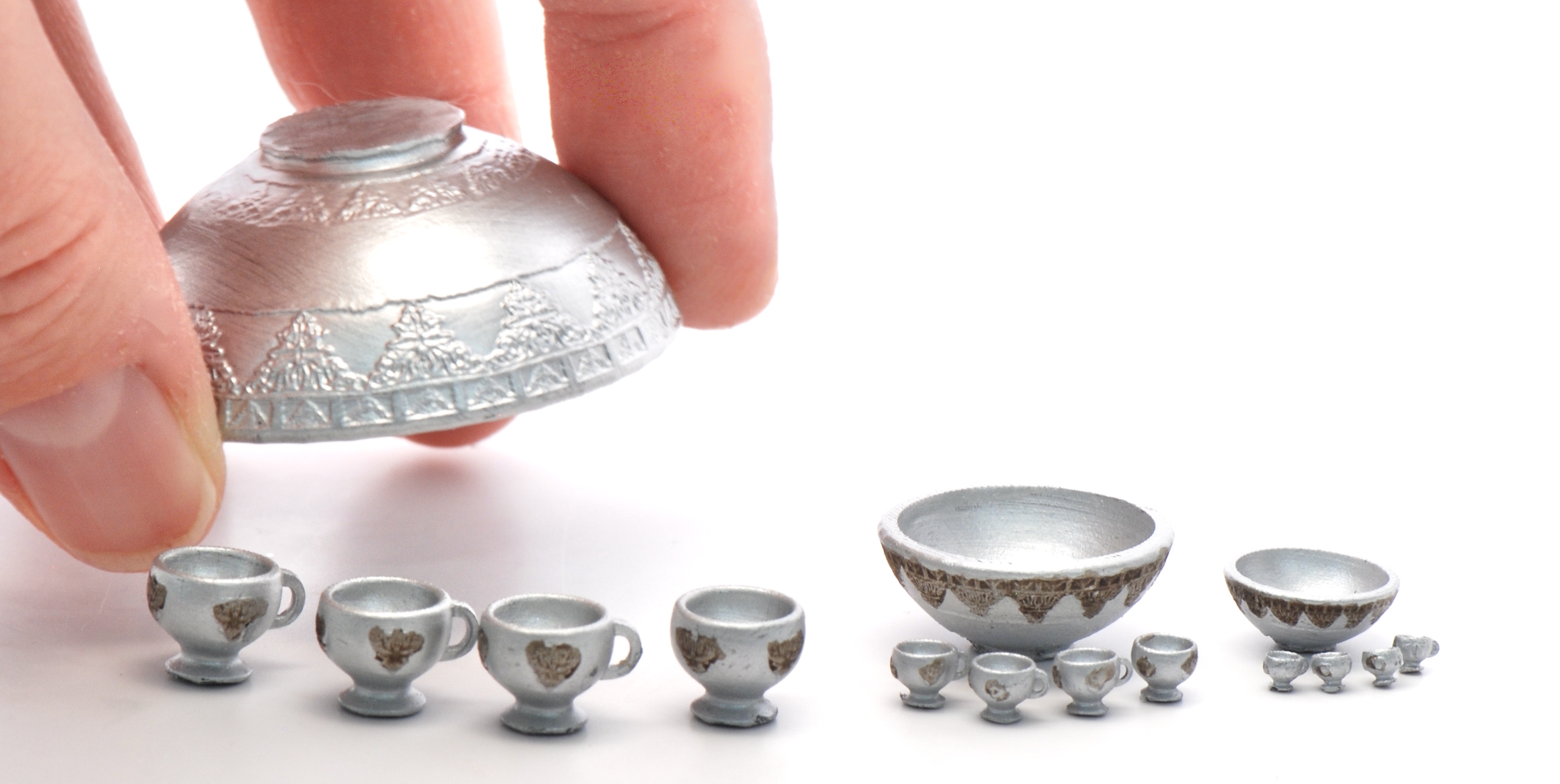 This fun new set of Christmas dishes is available in 1:12, 1:24 & 1:48 scales! They are 3D printed and are super easy to paint. I used a Silver Leaf Paint. We even have Eggnog Drizzle available to use in this kit. You will probably need 2 bottles to fill the 1:12 bowl and cups.