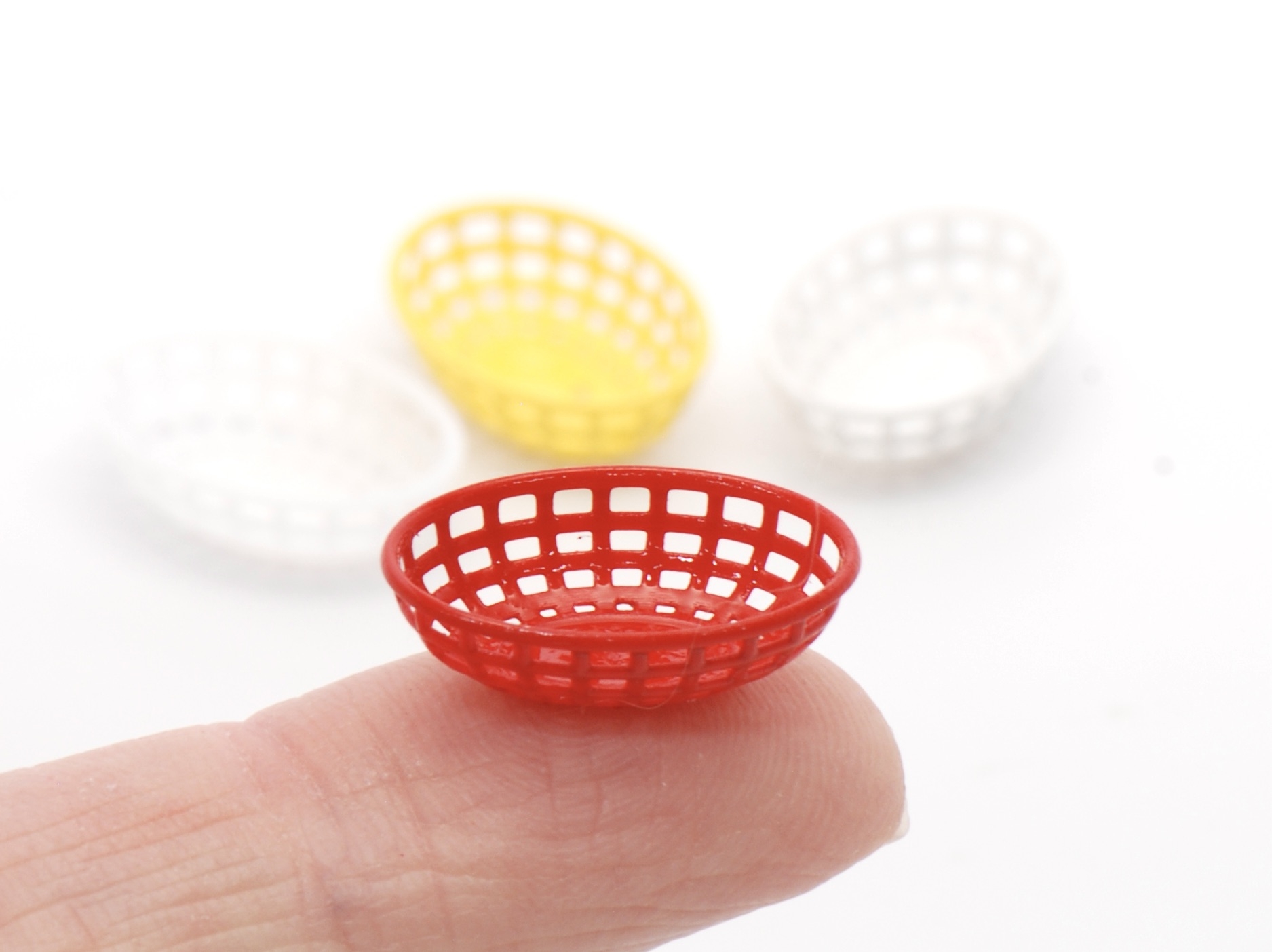 These are super fun new food baskets! They are 3D printed and come on supports to easily stick it down and spray paint it if you want it colored. The photo shows it colored in red, yellow and white and then the sample of just the white resin on the left that is not coored at all.