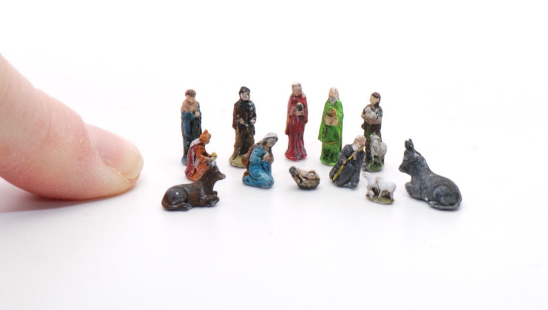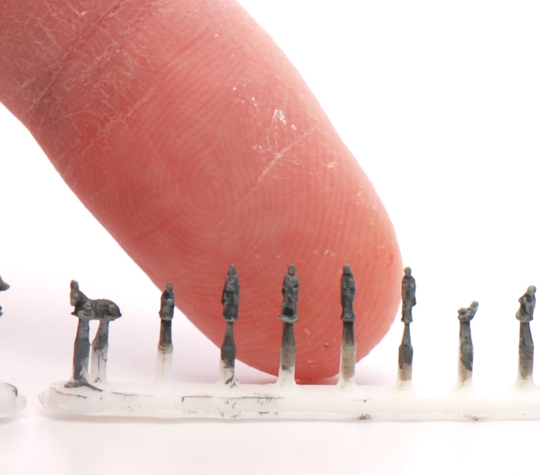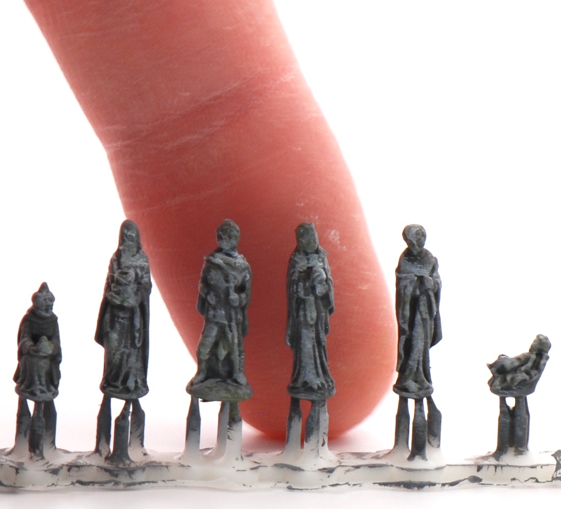 This nativity set of 12 figurines is wonderful! They can be painted with color or like the stone you can see in all the photos. I took pictures with my finger so you can see the side of each of them. The detail is wonder even in the 1:48 ones. I am not sure you would want to attempt color on the 1:48 ones. Probably painted them to look like stone, white marble or gold would be best. They are very tiny!