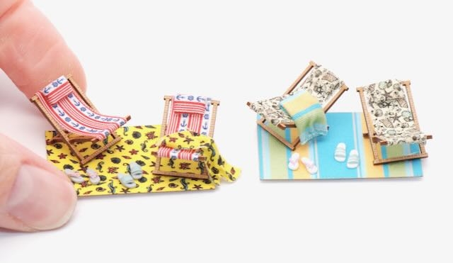 These adorable little set is full of fun and easy to complete! This is the "She Set" set and it comes with 2 beach chair kits, fabrics for the blankets, towels and chairs. It also comes with 2 adorable 3D printed set of sandals! Super fun for any beach scene!