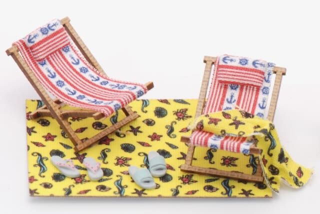 These adorable little set is full of fun and easy to complete! This is the "He Set" set and it comes with 2 beach chair kits, fabrics for the blankets, towels and chairs. It also comes with 2 adorable 3D printed set of sandals! Super fun for any beach scene!
