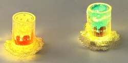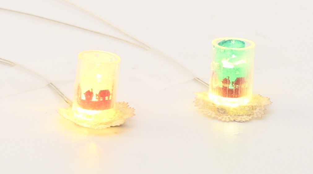 This is a brand new kit that you will love! All you do is paint the outside with clear fingernail polish. Then roll the papers and set inside. Inside is a candle and from underneath you inset the LED to lite it. There is Santa and his sleigh flying up above the roof tops. Being lit from the inside you can see the design in the papers from the outside. It's super cool! You can color your paper or leave it white. It will come with directions on how to do both and to hook up the wiring.