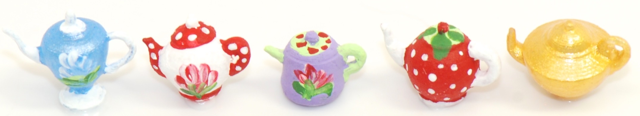 This is a wonderful set of 3D printed 1:48 tea pots. There are 5 different ones and can all be painted with acrylic paint. Beautiful for any miniature scene.