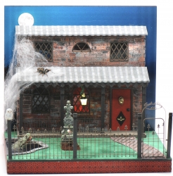 This southern gothic brick house is a little creepy at night... There is a flickering fire inside the house, one gravestone is lit a glowing spooky red and a yellow eerie cast from the lantern held up by a tentacle arm floods the porch. A zombie arm is pushing out of the freshly dug grave while an alligator is submerging from the pond to see what all the fuss is about. "Hoo Hoo," says the owl, sitting on the fence post while the spider slowing creeps down the side of the house to find his prey.