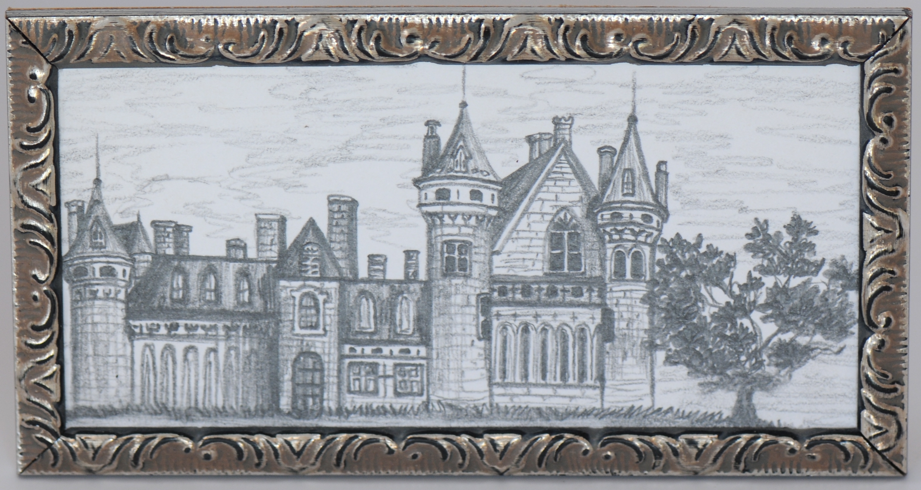 This is an original pencil drawing of a castle, drawn by the artist Megan Zupan. It measures 4 5/8" by 2 1/2" and is meant to be a large size piece of 1:12 scale art work.