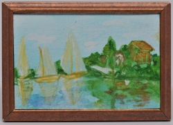 This is a painting of sailboats on a lake, drawn by the artist Megan Zupan. It measures 3 3/8" by 2 7/16" and is meant to be a medium size piece of 1:12 scale art work.