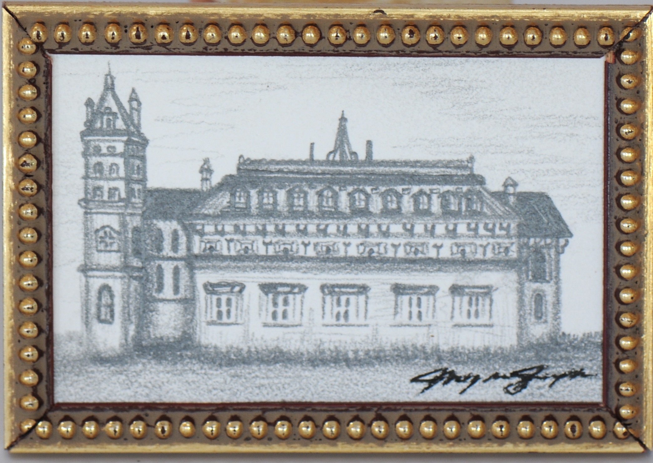 This is an original pencil drawing of a Manor House, drawn by the artist Megan Zupan. It measures 3 1/8" by 2 3/16" and is meant to be a medium size piece of 1:12 scale art work.