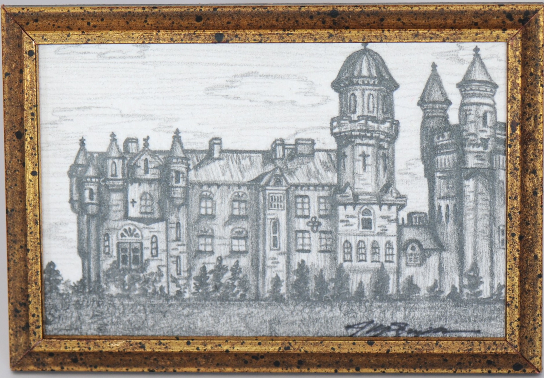 This is an original pencil drawing of a castle, drawn by the artist Megan Zupan. It measures 3 7/8" by 2 3/4"" and is meant to be a large size piece of 1:12 scale art work.