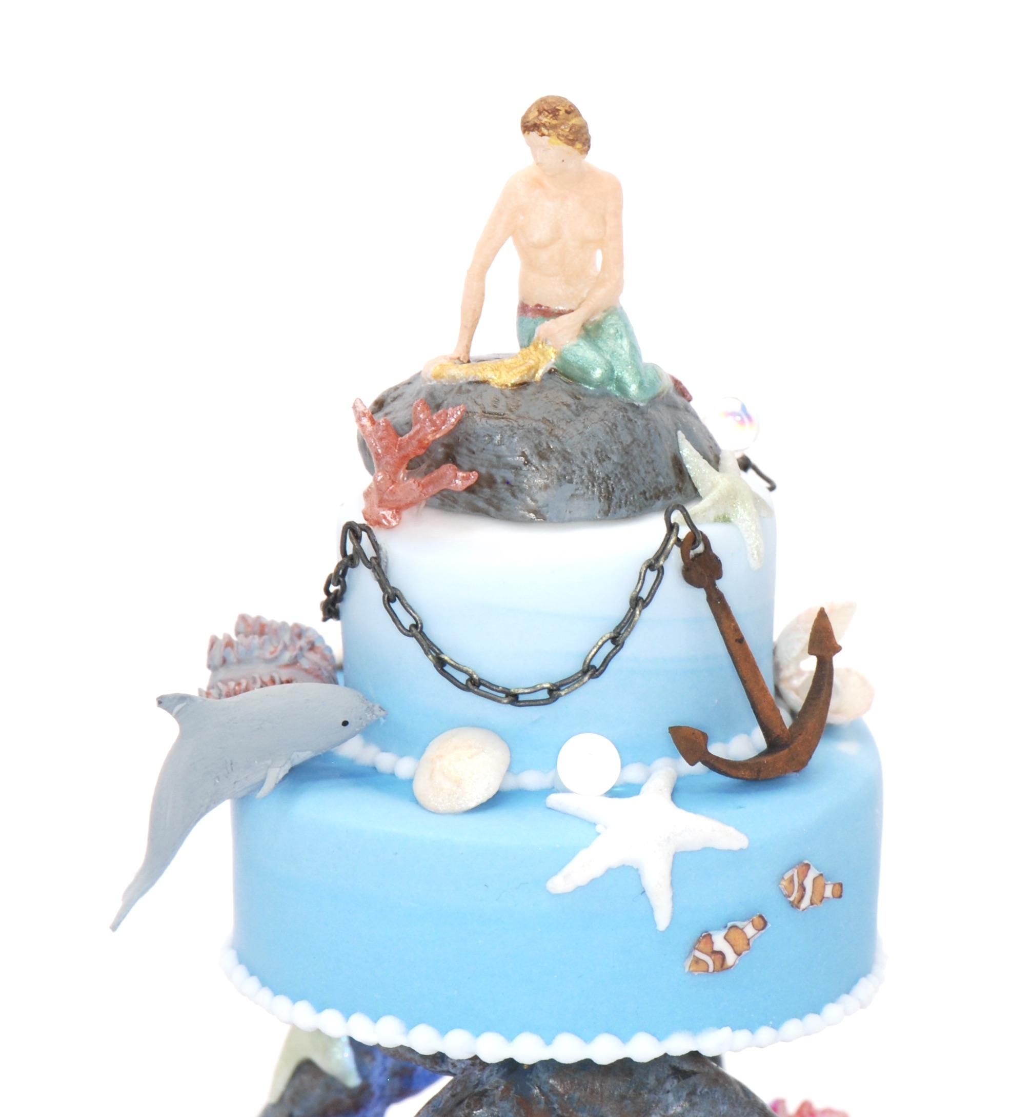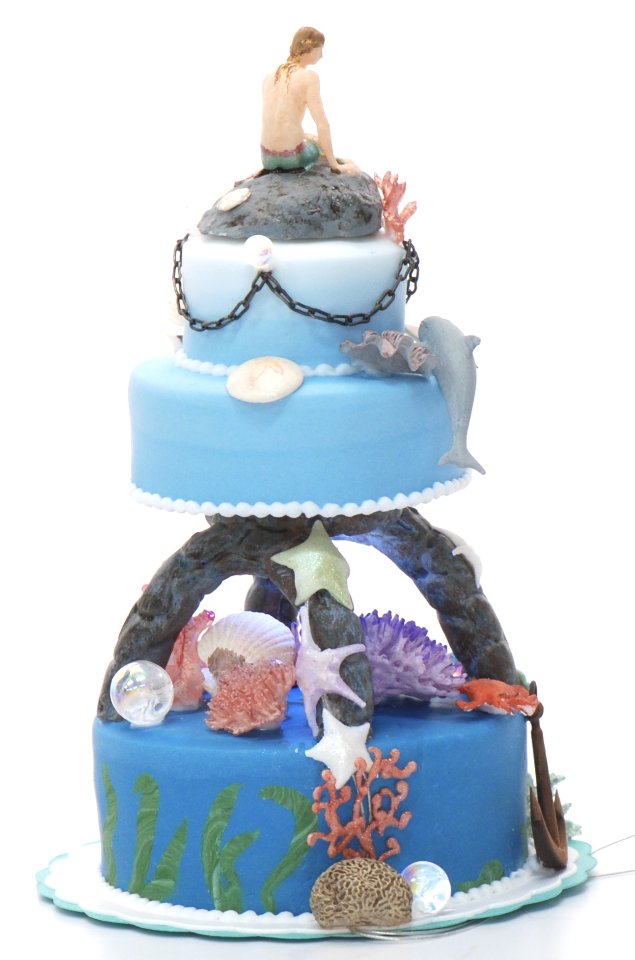 To top of this beautiful cake it comes with a mermaid statue sitting on a rock for the top. If you want this pre painted you can pay extra and she will come painted.