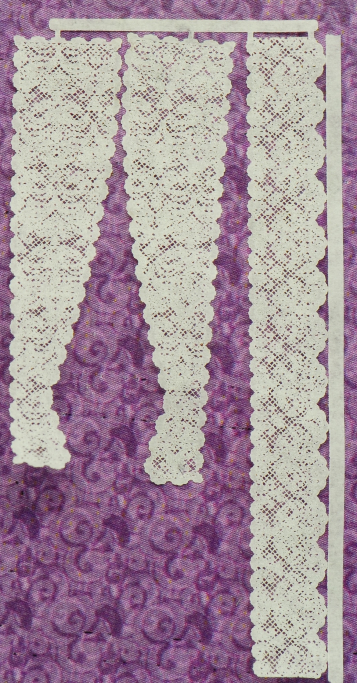 These are delicately intricate and thin 1:48 Lace curtains. The pattern is Damask and this curtain that is gathered at the bottom of the curtain. They are laser cut out of a high quality white paper. This set is designed to be used on a single set of windows. They can be trimmed at the top to make shorter and the valance can be trimmed on the sides as well.