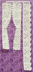 These are delicately intricate and thin 1:48 Lace curtains. The pattern is Damask and this curtain that is gathered in the middle of the curtain. They are laser cut out of a high quality white paper. This set is designed to be used on a single set of windows. They can be trimmed at the top to make shorter and the valance can be trimmed on the sides as well.