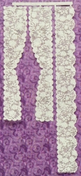 These are delicately intricate and thin 1:48 Lace curtains. The pattern is Roses and this curtain that is gathered in the middle of the curtain. They are laser cut out of a high quality white paper. This set is designed to be used on a single set of windows. They can be trimmed at the top to make shorter and the valance can be trimmed on the sides as well.