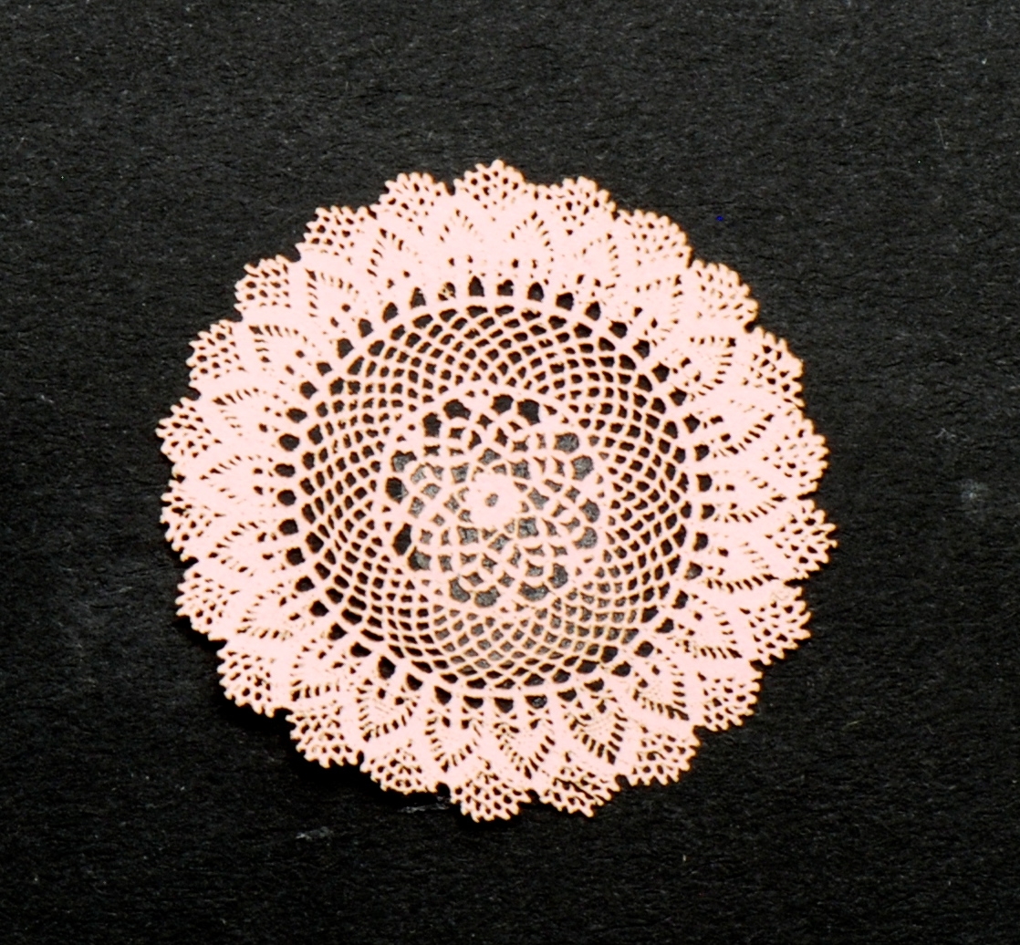 This is a replica Laser cut Doily from an original full size antique Doily. These doilies are all very intricate, and look almost as if they are lace. The photo just can't do it justice. It is cut on a pink colored paper. This is a 1 1/16" doily, used for any food or table decoration.