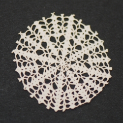 This is a replica Laser cut Doily from an original full size antique Doily. These Doilies are all very intricate, and look almost as if they are lace. The photo just can't do it justice. It is cut on an off white antique colored paper. This is a 1 1/4" Doily, used for any food or table decoration.