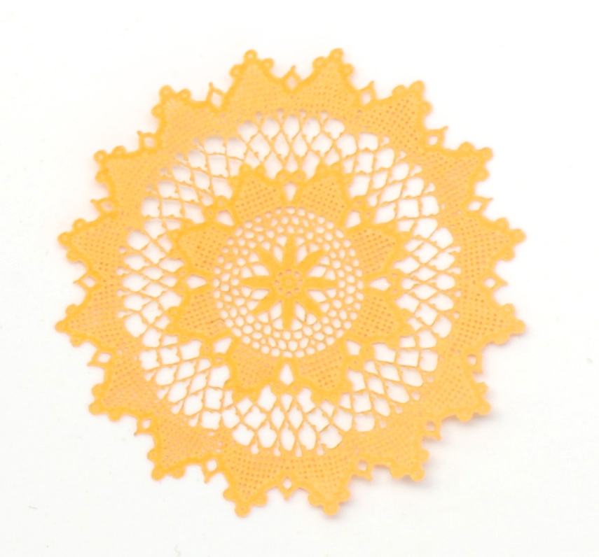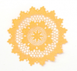 This is a replica Laser cut Doily from an original full size antique Doily. These doilies are all very intricate, and look almost as if they are lace. The photo just can't do it justice. It is cut on a orange colored paper. This is a 1 1/8" doily, used for any food or table decoration.