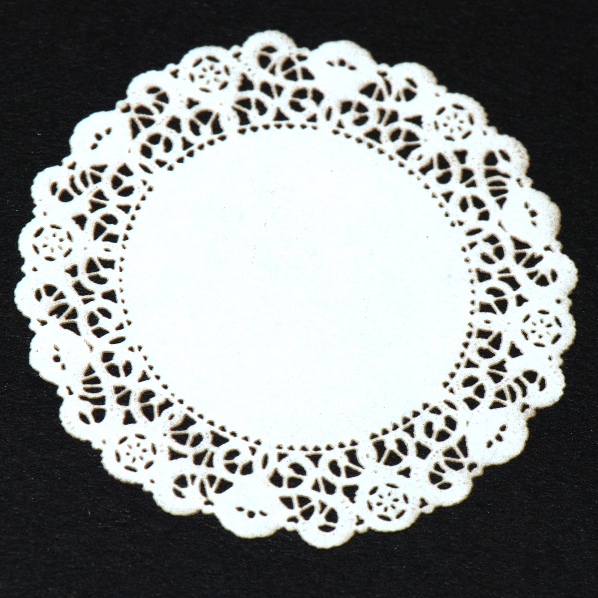 This large doily is cut on a white paper and is a 1 3/8" round Doily, used for any food or table decoration.
