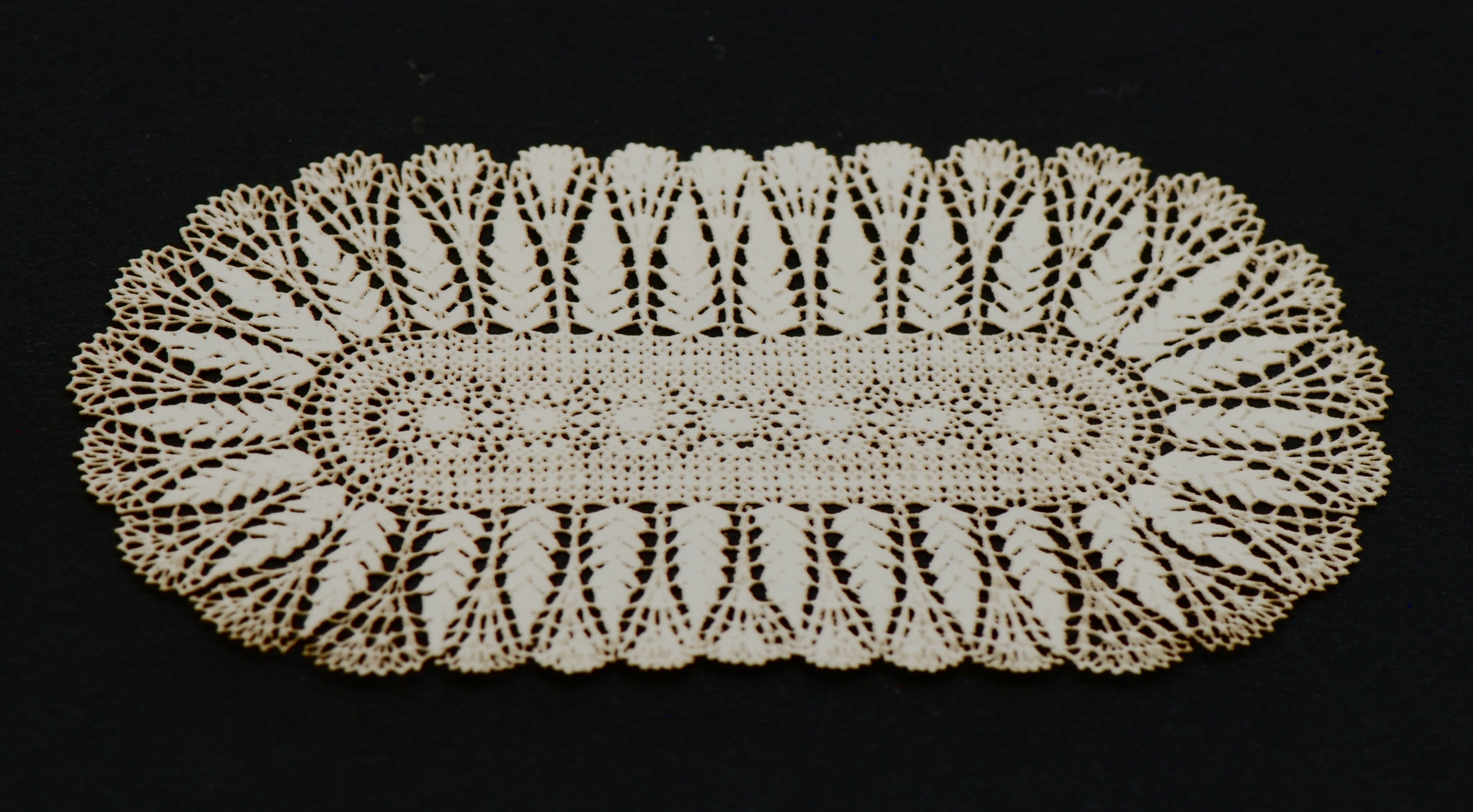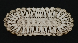 This is a replica Laser cut Doily from an original full size antique Doily. These doilies are all very intricate, and look almost as if they are lace. The photo just can't do it justice. It is cut on an off white antique colored paper. This is a 2 3/16" by 1 1/16" doily, used for any food or table decoration.