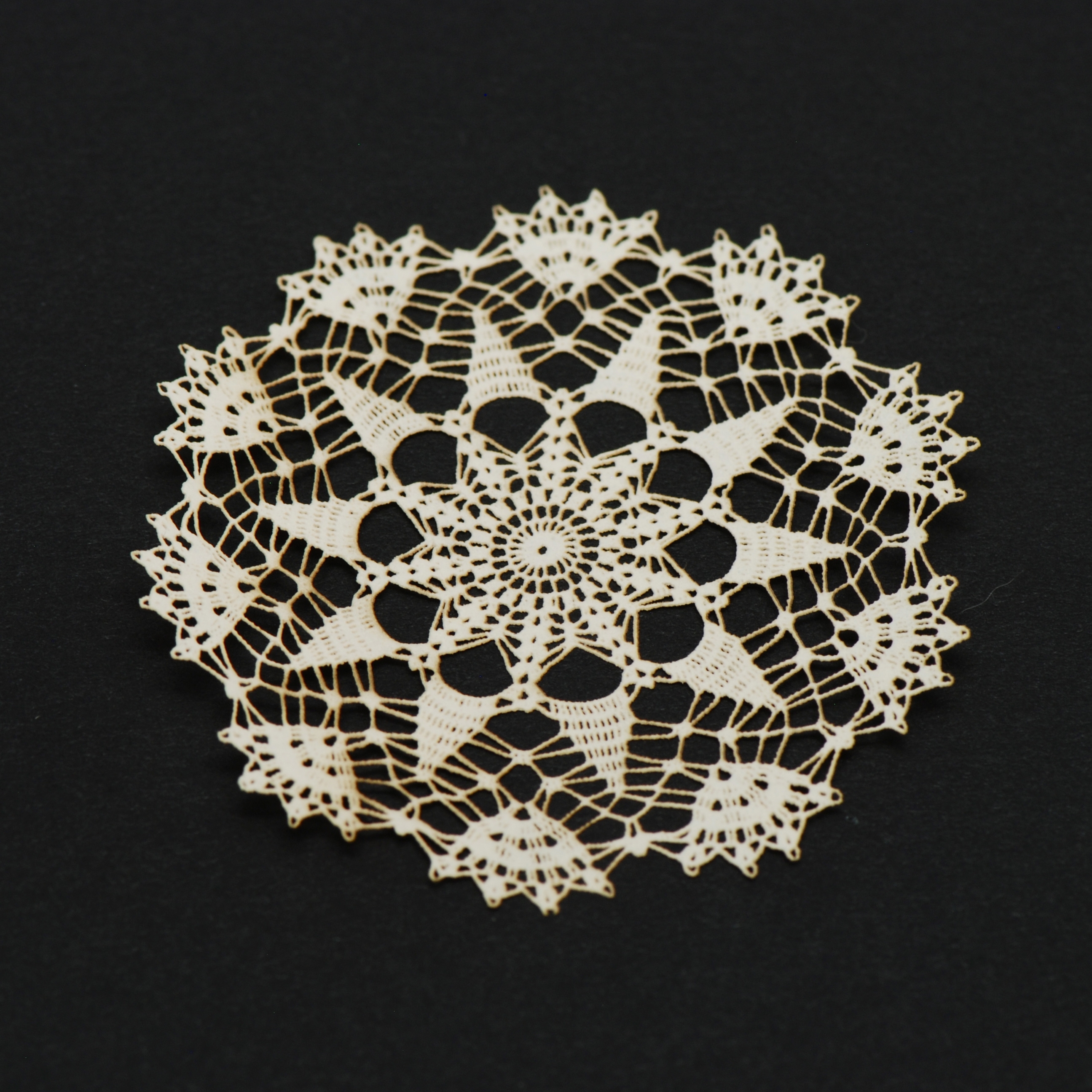 This is a replica Laser cut Doily from an original full size antique Doily. These doilies are all very intricate, and look almost as if they are lace. The photo just can't do it justice. It is cut on an off white antique colored paper. This is a 1 3/4" doily, used for any food or table decoration.