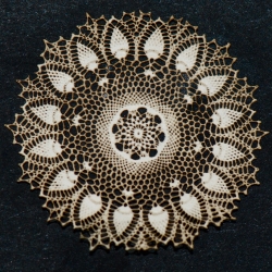 This is a replica Laser cut Doily from an original full size antique Doily. These doilies are all very intricate, and look almost as if they are lace. The photo just can't do it justice. It is cut on an off white antique colored paper. This is a 1 3/16" doily, used for any food or table decoration.