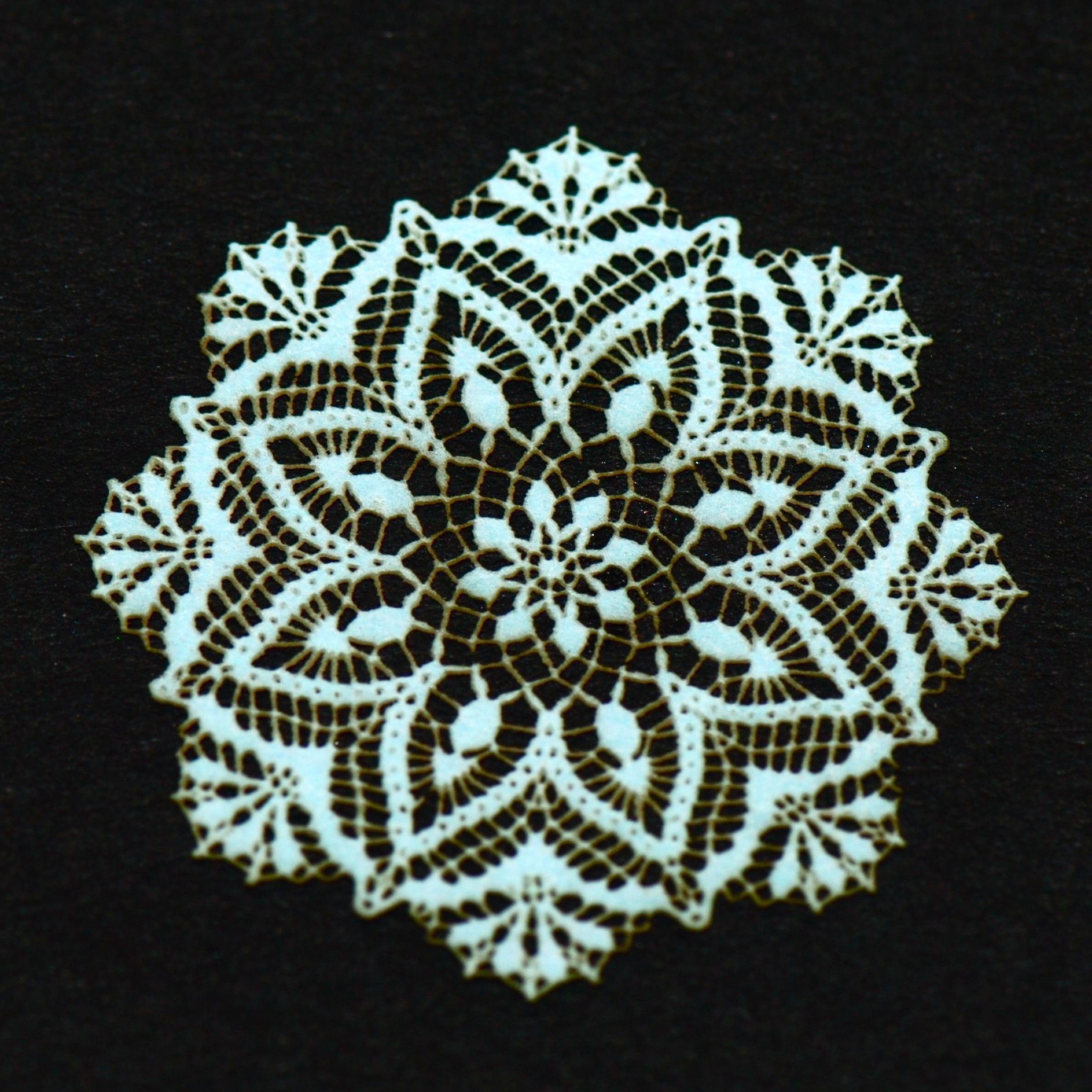This is a replica Laser cut Doily from an original full size antique Doily. These doilies are all very intricate, and look almost as if they are lace. The photo just can't do it justice. It is cut on a pastel blue colored paper. This is a 1 1/4" doily, used for any food or table decoration.