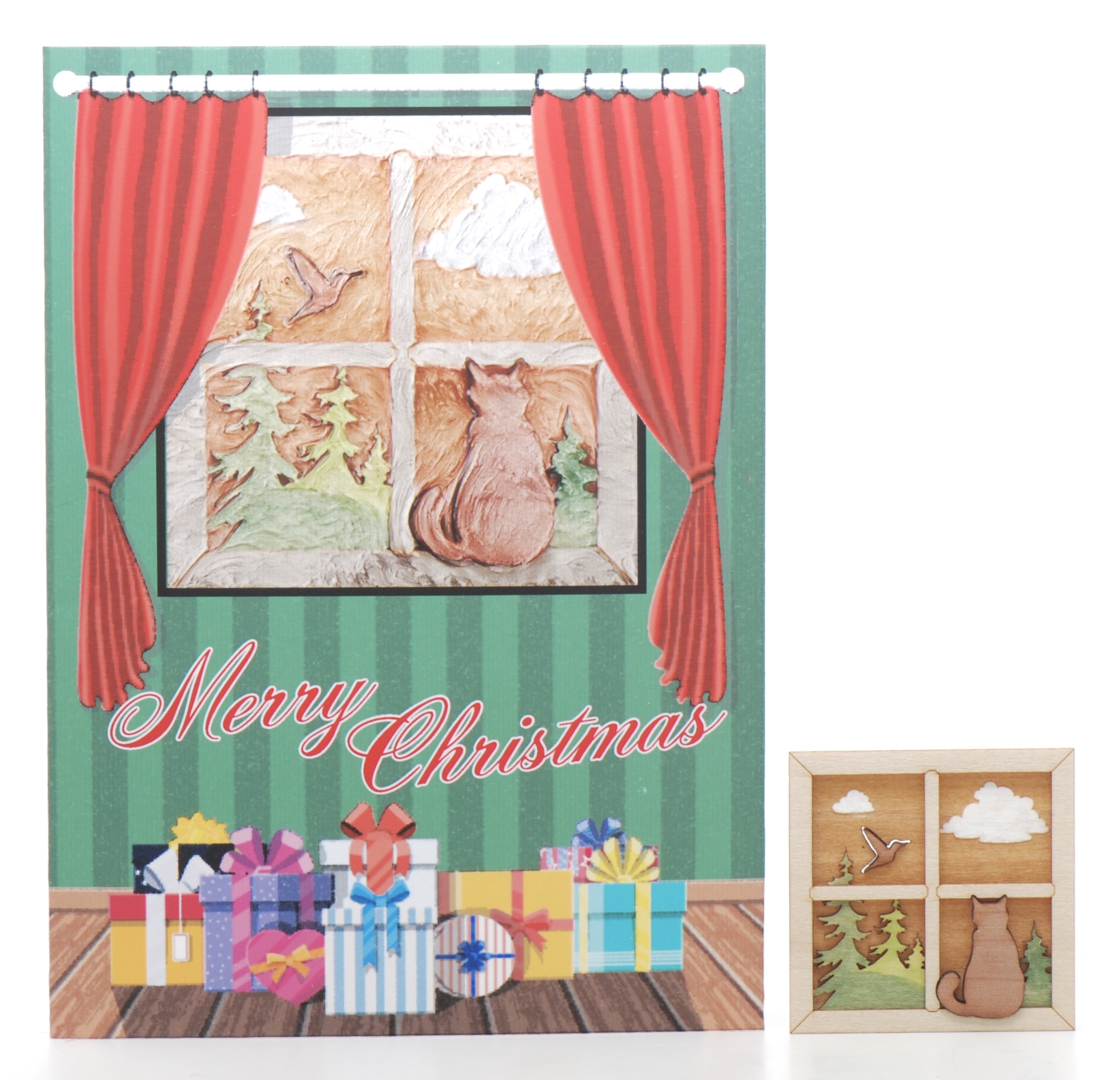 This Kit Card is called "Enjoying the View". This kitty sitting in his window was inspired by Sophia's cat Cedar. This kit card kit is compiled with different layers of wood textures and types of wood. The cat and his humming bird friend are cut out actual cedar wood.