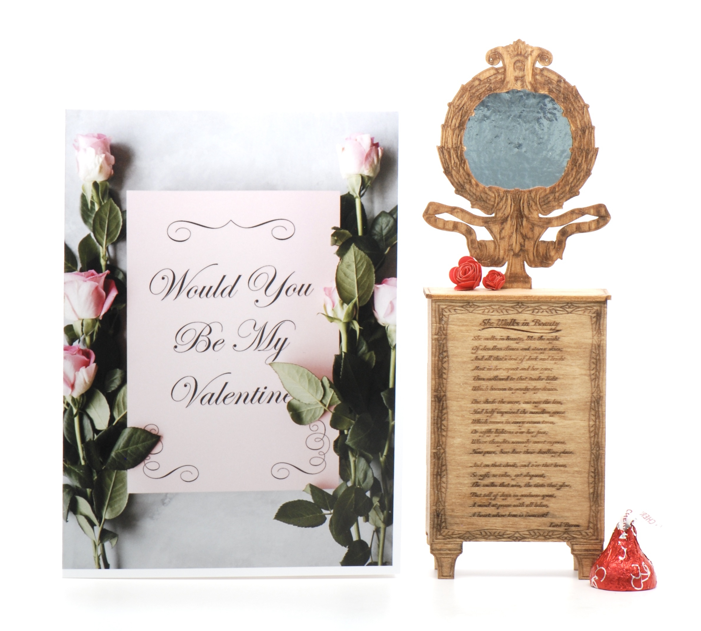 This beautiful stand alone piece is super quick and easy to put together, just stain and glue. It will come with detailed color directions on how to assemble your mirror stand. On the front of the stand is the poem "She Walks In Beauty" by Lord Byron. Below is the poem. It is 1:12 scale but can be given as a gift for anyone to enjoy! Kisses not included. ![]()