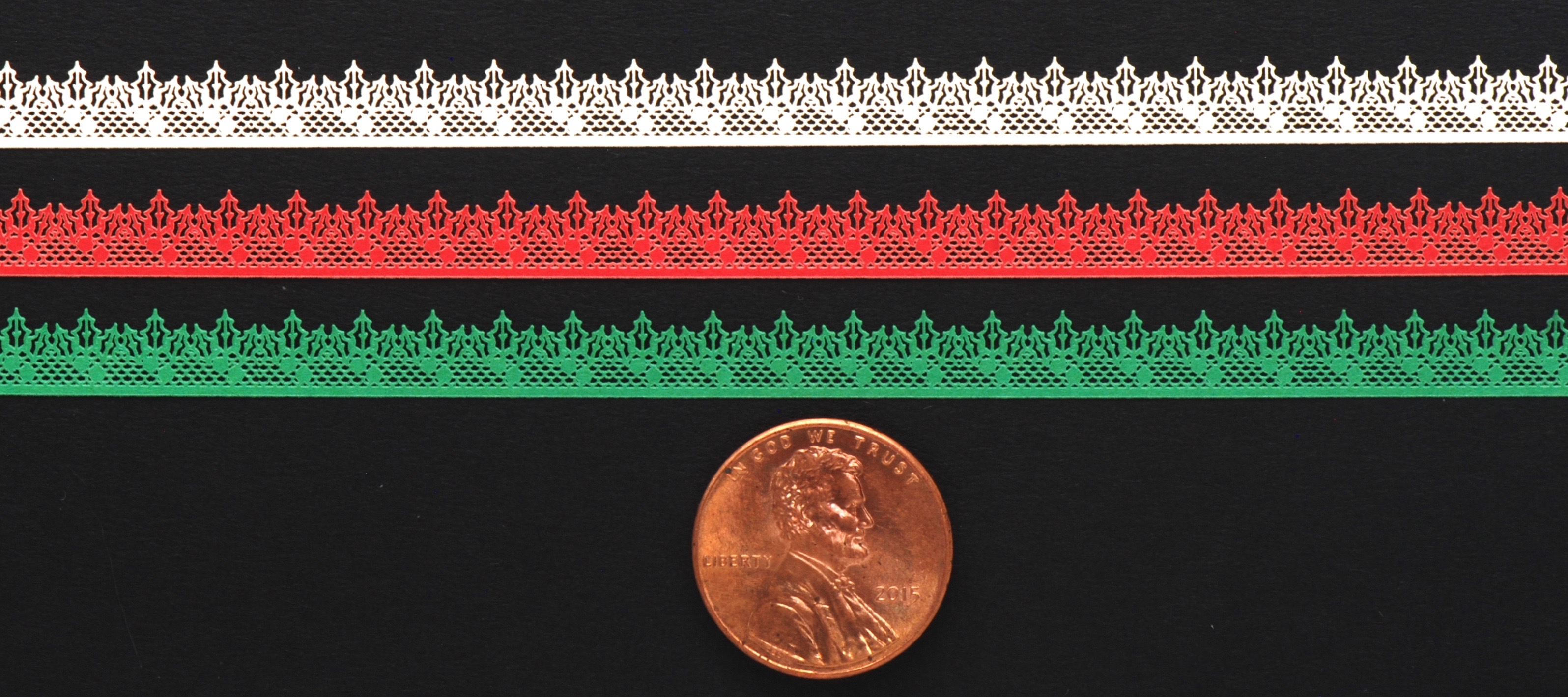 This is brand new laser lace! The design is intricately cut Christmas candles with holly leaves around the candles. The strip is absit 9 1/2" long. 6.2 mm (1/4") tall at the highest point.