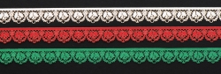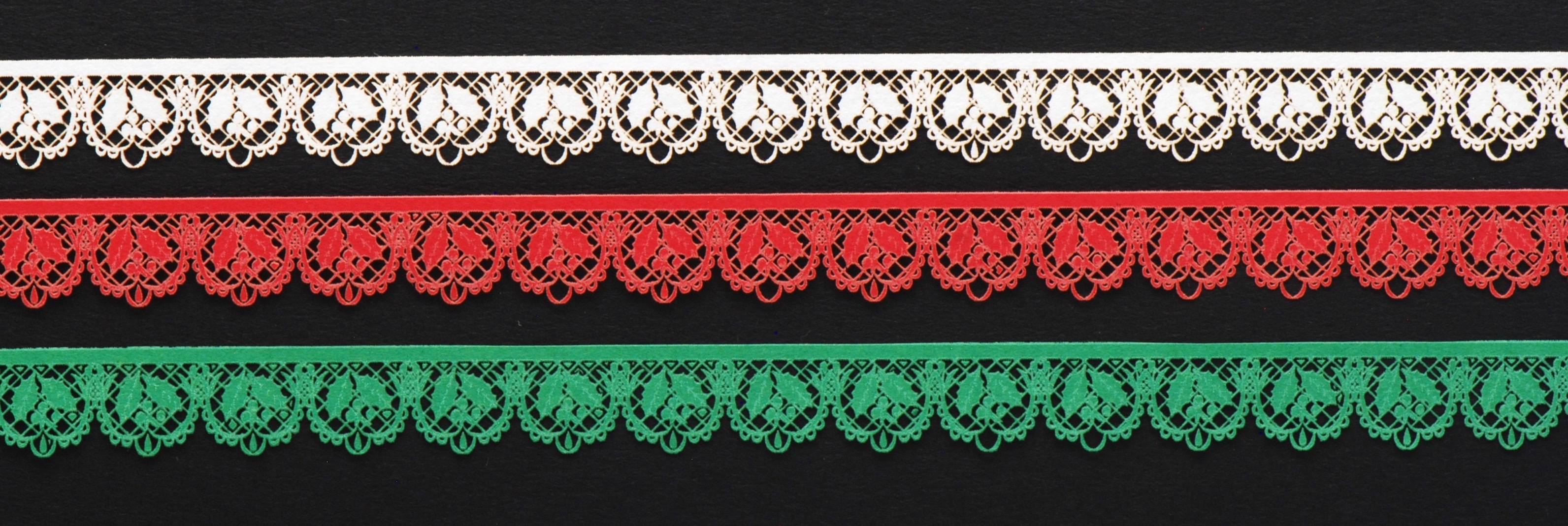 You can choose between green, red or white lace trim. The white can be colored with alcohol markers to bring out the design you want highlighted.