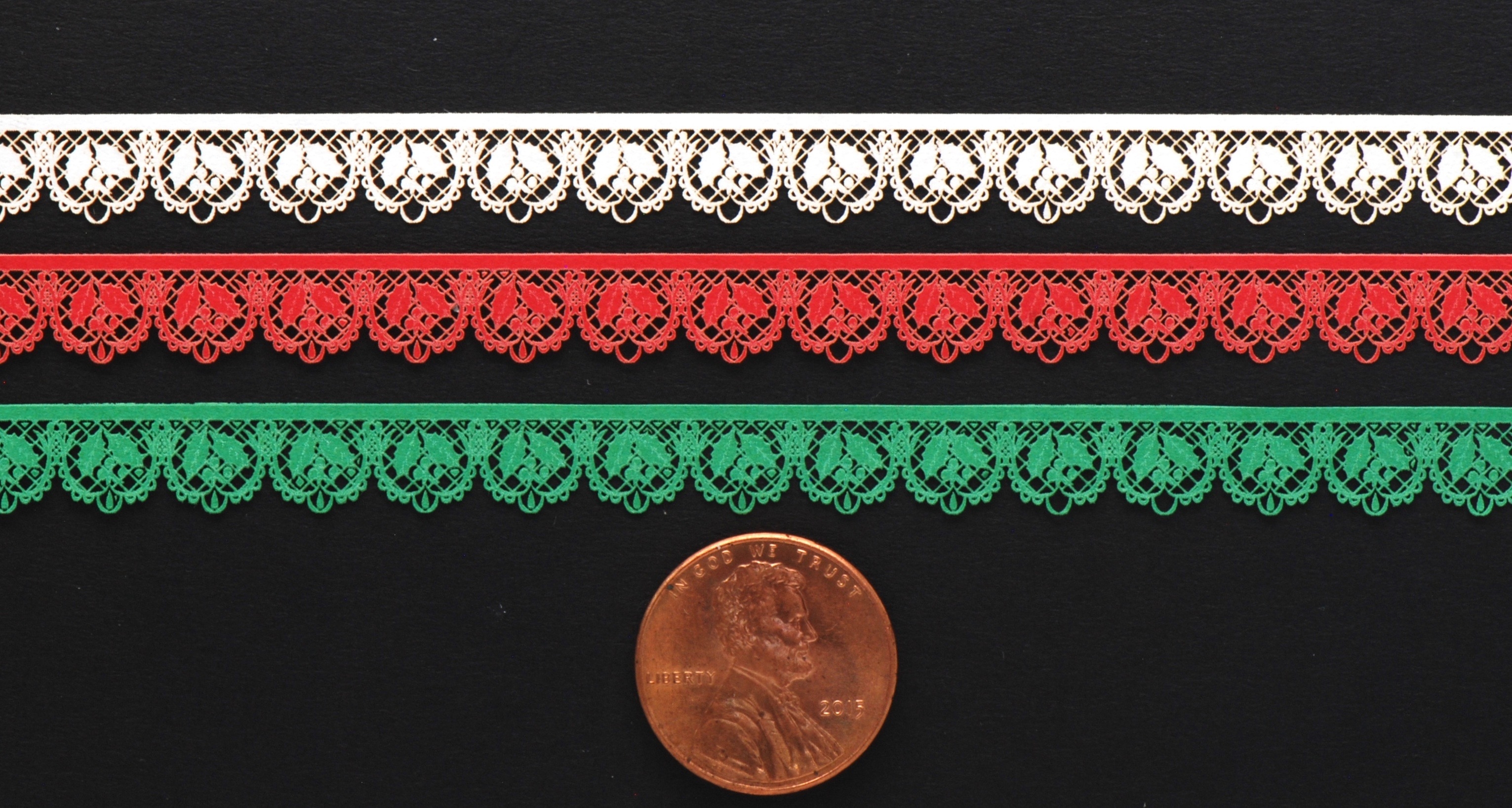 This is brand new laser lace! The design is intricately cut holly leaves with berries. The strip is about 9 1/2" long. 7.8 mm (5/16") tall at the highest point.