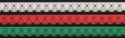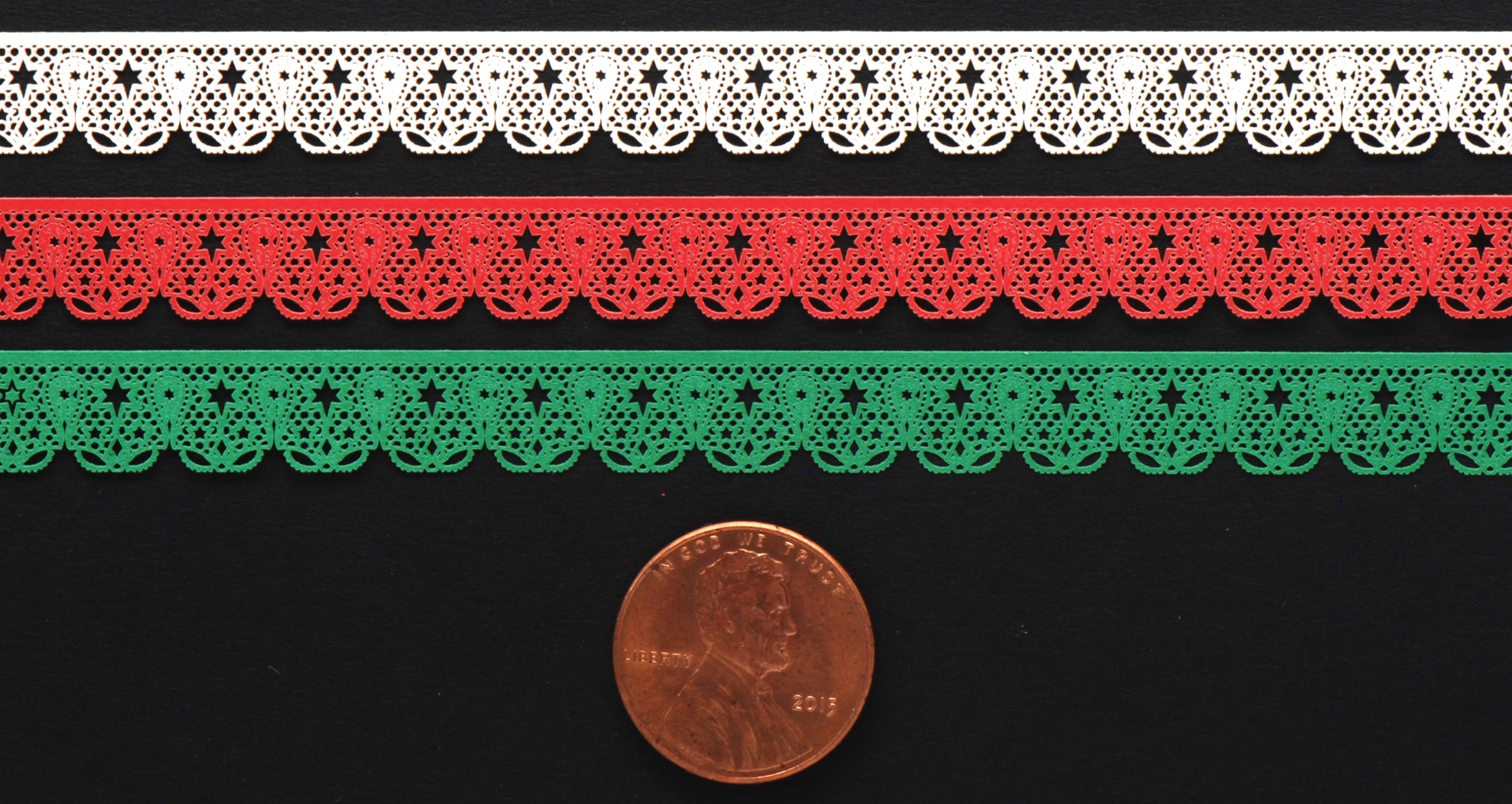 You can choose between green, red or white lace trim. The white can be colored with alcohol markers to bring out the design you want highlighted.