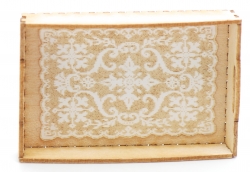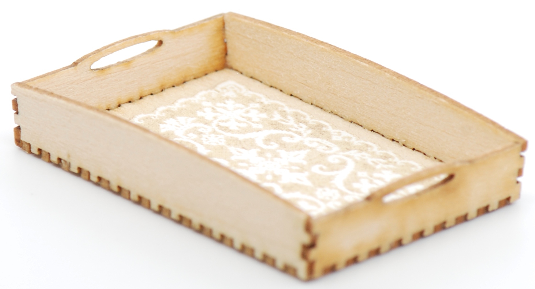 This is a Laser Cut tray kit for tea and pastries. It comes with a beautifully intricate doily that fits perfectly in the tray. The size is 1 1/2" by 1". The kit is very easy to put together and just needs glue. You can stain or paint it!