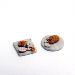 This is 2 1:48 scale loaves of light wheat bread sliced on a round and square marble cutting board. The loaves of bread and the boards are handcrafted from polymer clay. The loaves are about 3/16" long and the cutting boards are 1/4" wide. Each set is unique and life like.