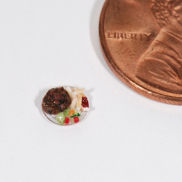 This is a satisfying dinner. It comes on 3/16" Linden Swiss Plates. The steak is very juicy looking and comes with crunchy french fries and a green salad. It is made from polymer clay.