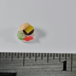 This is a tiny cheese burger on a paper plate with the fixings, tomatoes and lettuce.