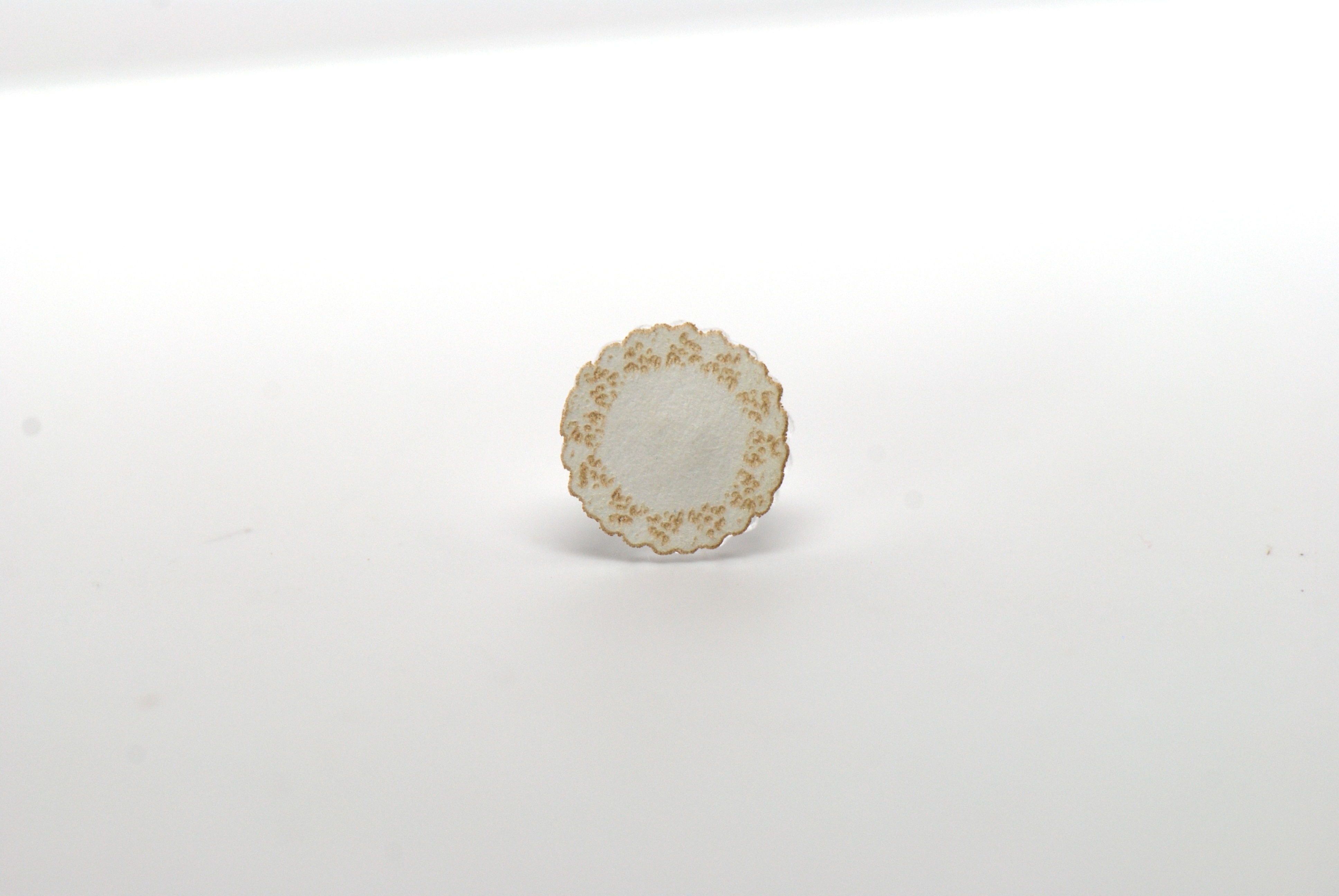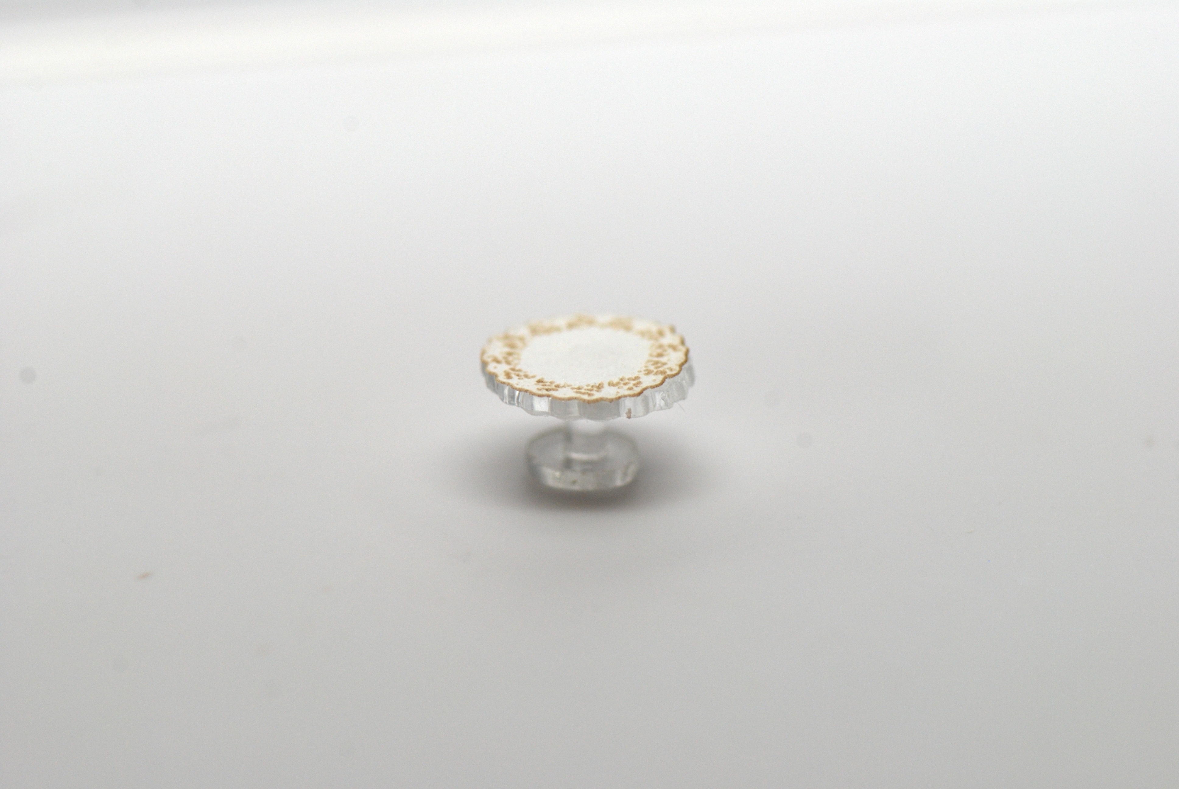 This is a quarter scale cake plate made from acrylic. The cake plate is 5/16" wide and comes with a doily attached on top.