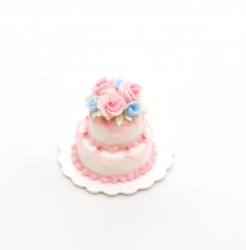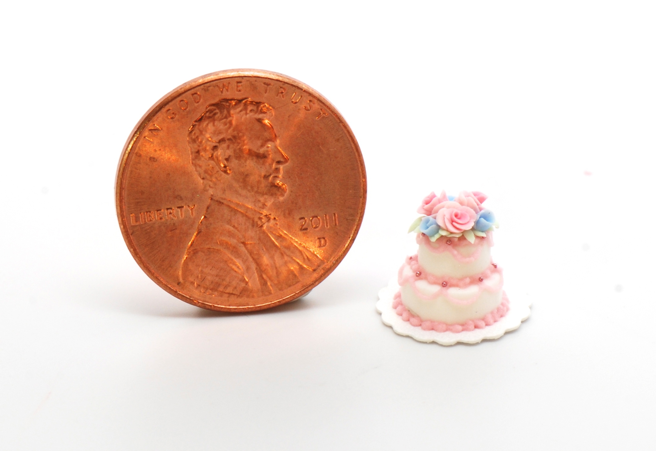 This is a 1:48 scale 2 tier white cake with pink trim, tiny green leaves and pink roses. Tiny pink pearls complete this cake. It is hand crafted from polymer clay and is not painted. A beautiful addition to any Tiny Scene!