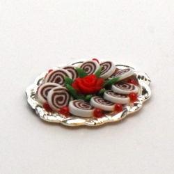 This is a 1:48 scale Christmas Platter. It is hand crafted from polymer clay and comes on a shiny sliver platter. There are holly berries around the slices and a red rose in the center. Each platter is unique and life like. A beautiful addition to any Tiny Scene!