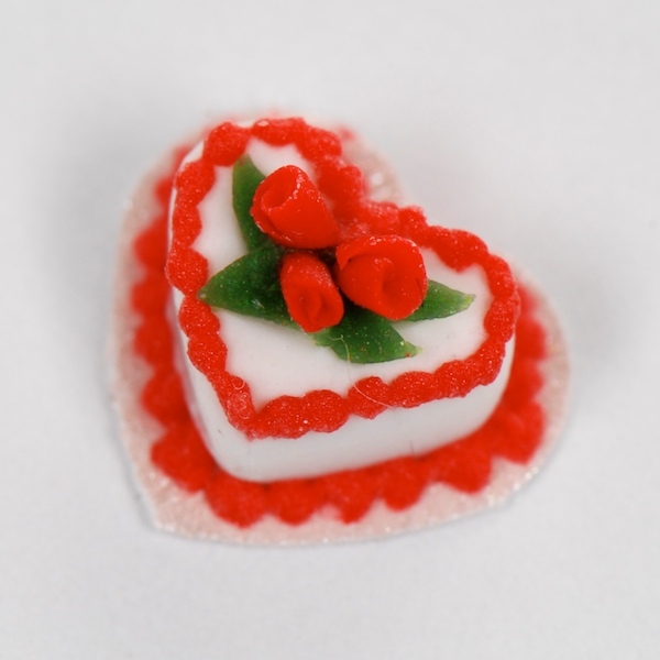 This is a 1:48 scale white heart cake with tiny green leaves and red rose buds. It is hand crafted from polymer clay and is not painted. It is 7/32" wide or 5 mm wide. A beautiful addition to any Tiny Scene!
