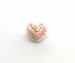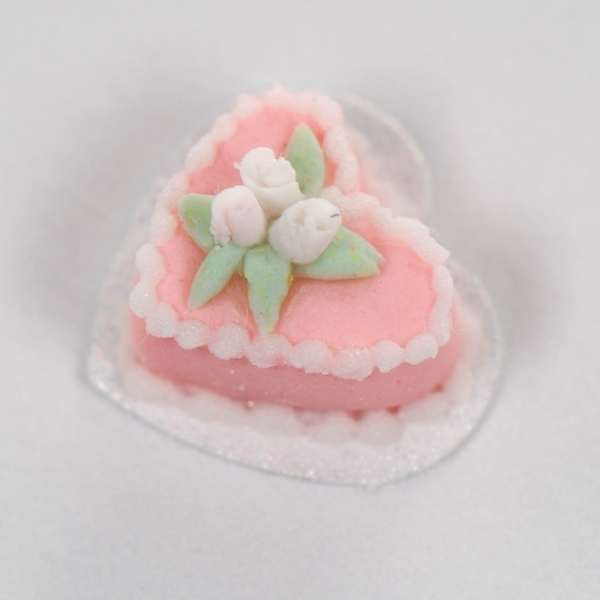 This is a 1:48 scale pink heart cake with tiny green leaves and white rose buds. It is hand crafted from polymer clay and is not painted. It is 7/32" wide or 5 mm wide. A beautiful addition to any Tiny Scene!