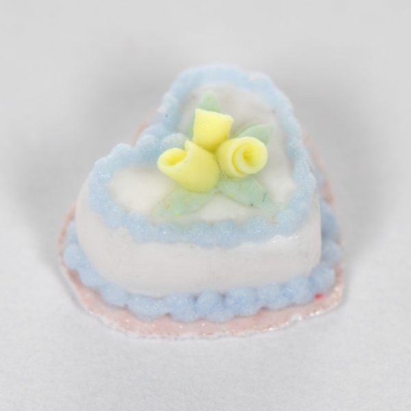 This is a 1:48 scale white heart cake with tiny green leaves and yellow rose buds. It is hand crafted from polymer clay and is not painted. It is 7/32" wide or 5 mm wide. A beautiful addition to any Tiny Scene!