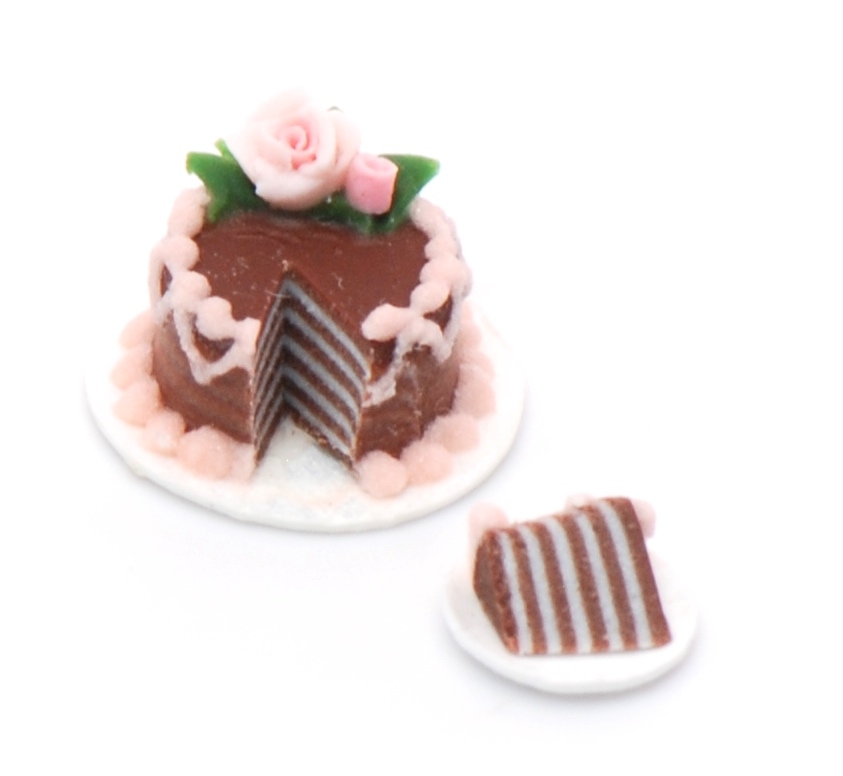 This is a 1:48 scale 5 layer chocolate cake with tiny green leaves and a pink rose. This cake has 5 layers of cake w/ white icing in-between. The slice is on a white paper plate. It is hand crafted from polymer clay and is not painted. A beautiful addition to any Tiny Scene!