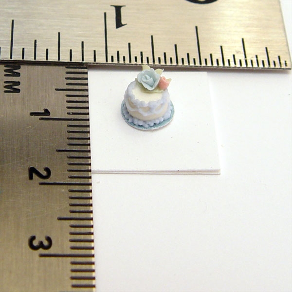 This is a 1:48 scale white cake with tiny green leaves and a blue rose with a pink rose bud. It is hand crafted from polymer clay and is not painted. A beautiful addition to any Tiny Scene!