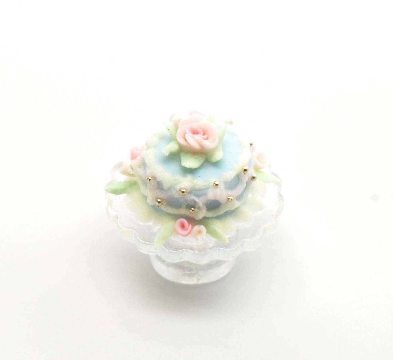 This is a beautiful TINY wedding cake on a acrylic cake stand. On the cake stand it's 3/8" tall by 23/64" wide on the cake plate (9.4 mm tall by 9mm). It's a light blue with ecru and pink lace piping and tiny beads along the edge. The tiniest roses you've ever scene finish this little creation.